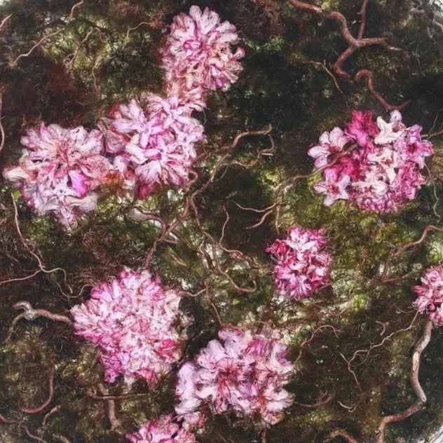 Rhododendron, hazel, mosses, resin & acrylic, 29” diameter