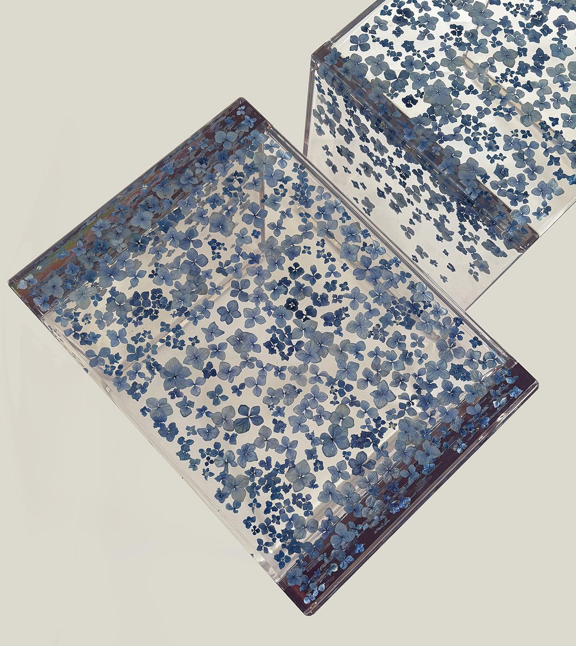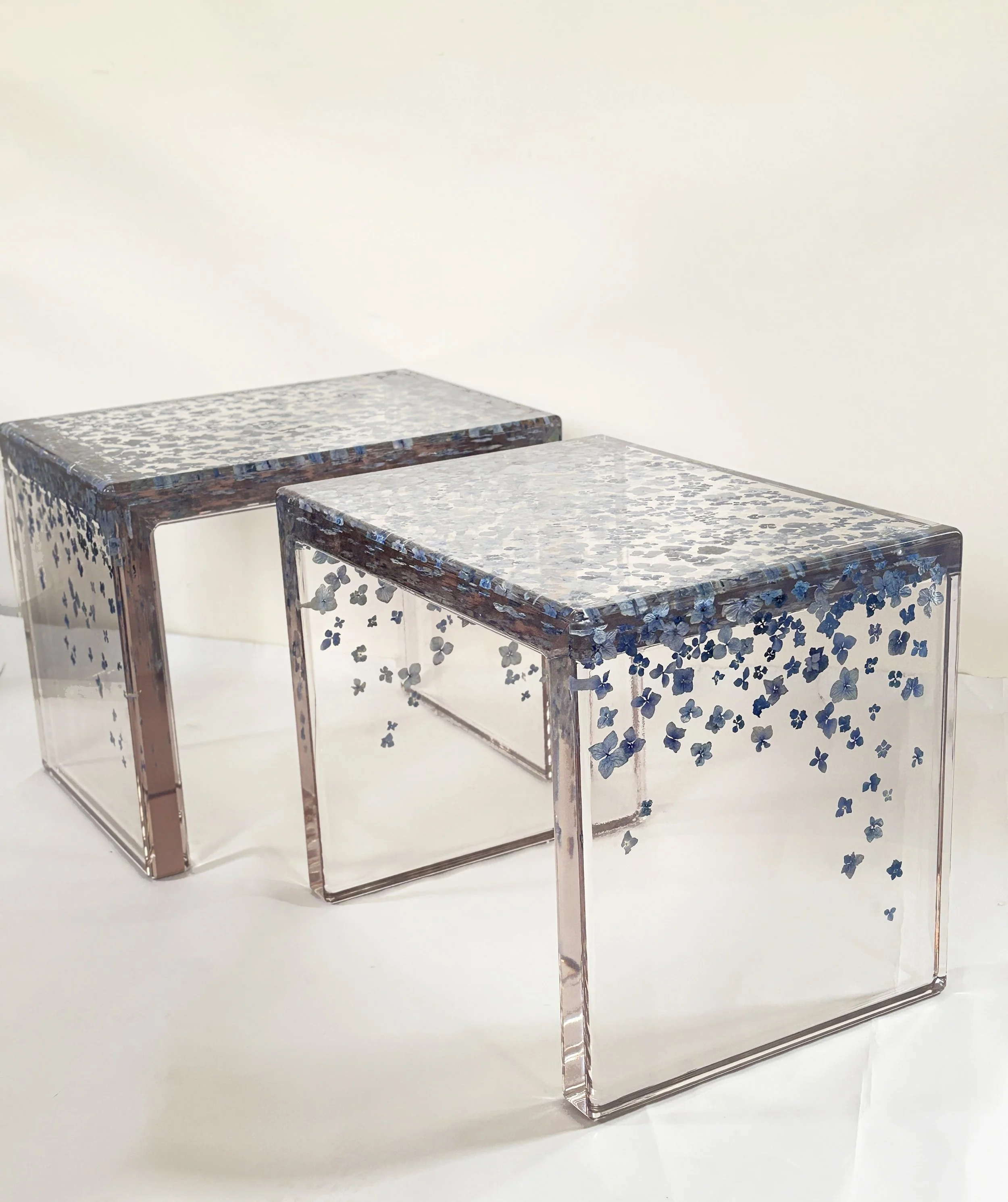 Blue hydrangeas, resin & acrylic, both 18” x 22” x 16”